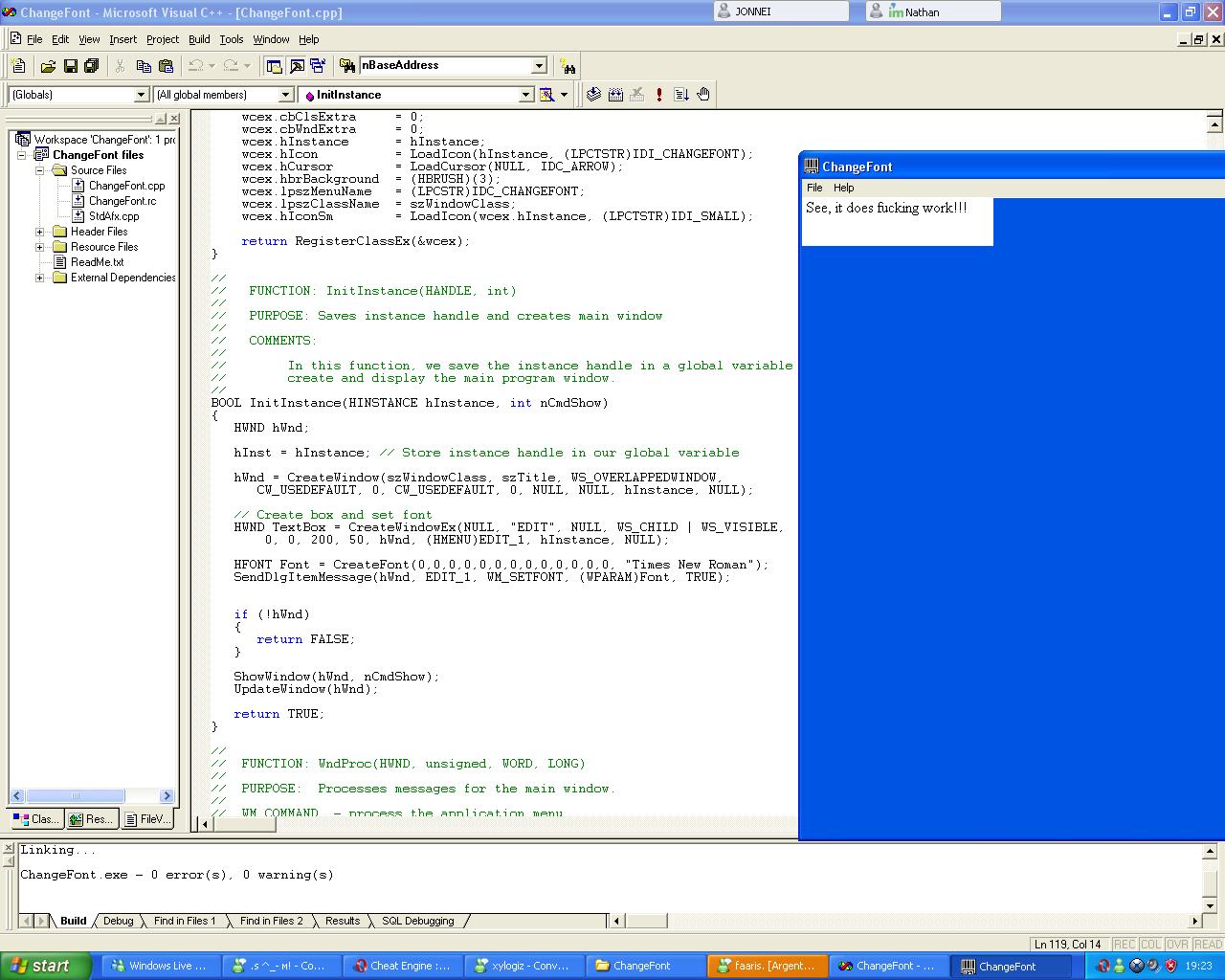 Well, I'm making a program. And whenever you type in the editbox it has this really ugly font. I want to know how to change the font that will be represented in the edit box. I tried searching for CreateFont() examples, but none of them were examples for edit boxes. If someone can give me an example code on how to do this with CreateFont() or any other way, it would be nice. Thanks.