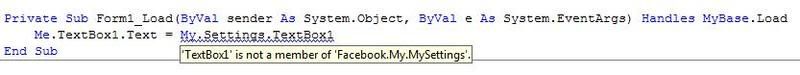 | Code: | My.Setting.TextBox1 = Me.TextBox1.Text