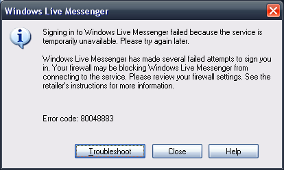 PostPosted: Sun Oct 05, 2008 4:59 pm    Post subject: MSN Login Error Code 80048883 Reply with quote