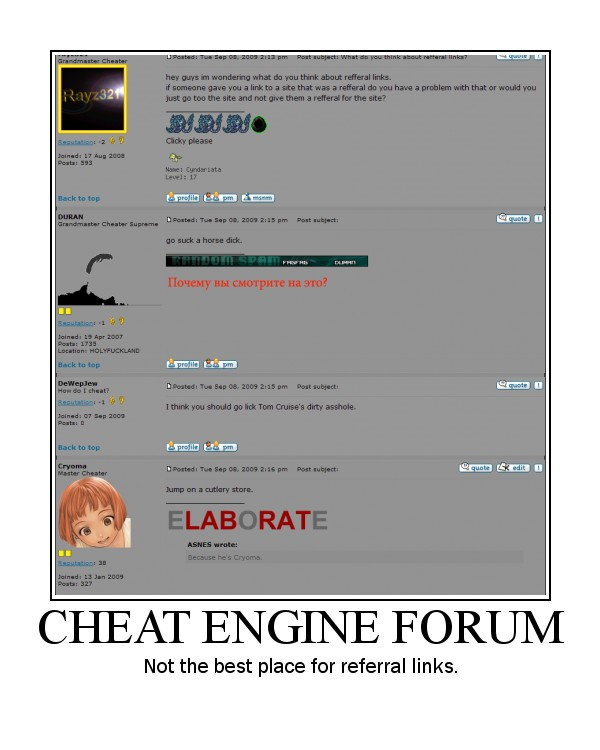 | Bobert8 wrote: | | So you staying online on cheat engine forums 24/7 and not being an annoying douche all the time makes you not a newfag? |
