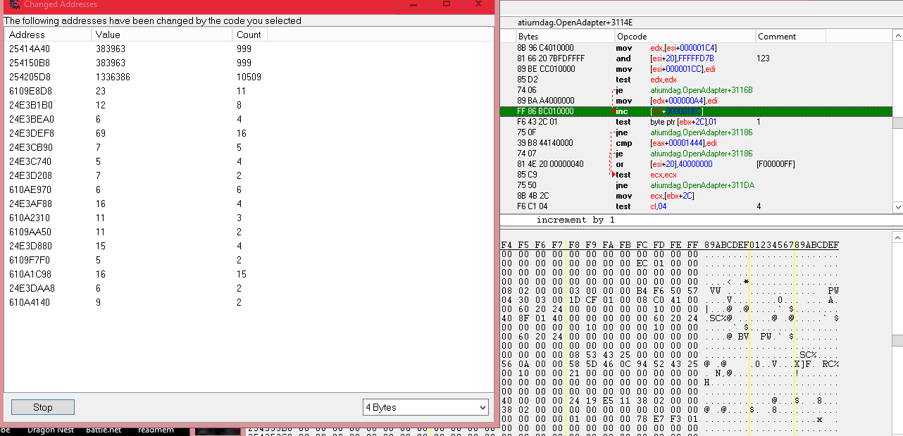 Ah thank you, sorry for the stupid questions it has been like a year since I have messed with any asm. Anyways, the address that deals with adding to the map also apparently has a lot more functions. The top 3 really high values in this photo are constantly being accessed. I don't know what they are though. The other lower values are being added everytime I find new areas of the map, but what is odd is that it will add one address and inc by 1 but then when I find more of the map it will add another address and inc that one by 1 plus the last one by one and it will continue doing that which is why all of the numbers are higher.. What is happening here? I don't understand how this game is storing the map information.. (one value is 69 because I tried adding 50 to it to see what would happen, nothing happened)