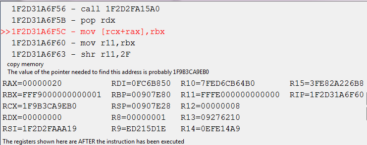But in second case if you put the FFFE in and make the RCX value with 8-bytes (FFFE02878A442B68) the result still the same.