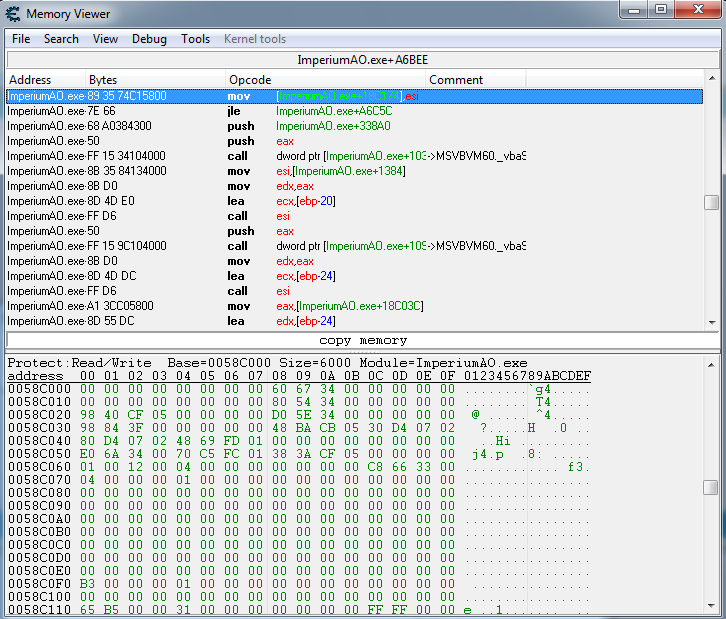 004A6BEE - 89 35 74C15800 - mov [ImperiumAO.exe+18C174],esi <<